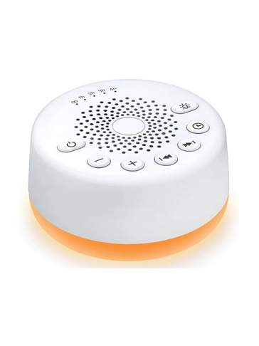 A compact white noise machine designed to create a calming sleep environment with multiple soothing sounds, adjustable volume, and timer settings. Perfect for improving sleep quality, reducing noise, and creating a more relaxing space.