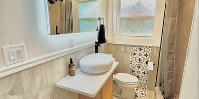 Fresh & functional. Full bathroom stocked with towels, starter toiletries, and a hair dryer for your convenience.